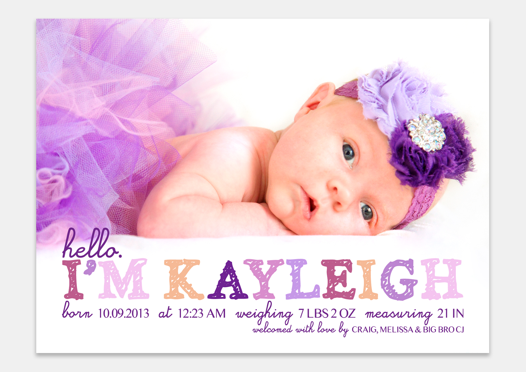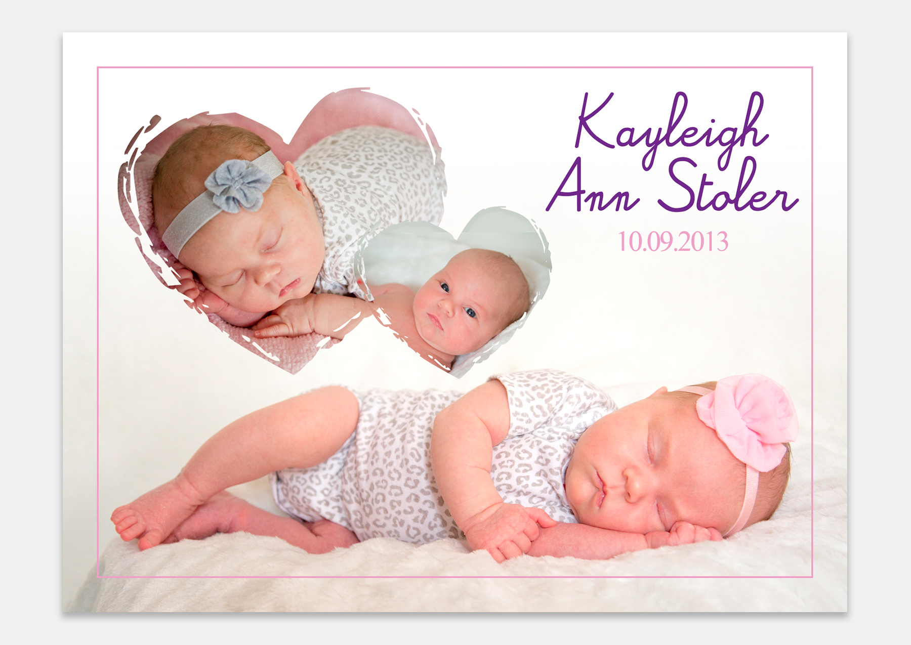 After the photoshoot I was challenged with putting together a birth announcement for the newborn. With just a few small requirements from the parents I put together this postcard style design.